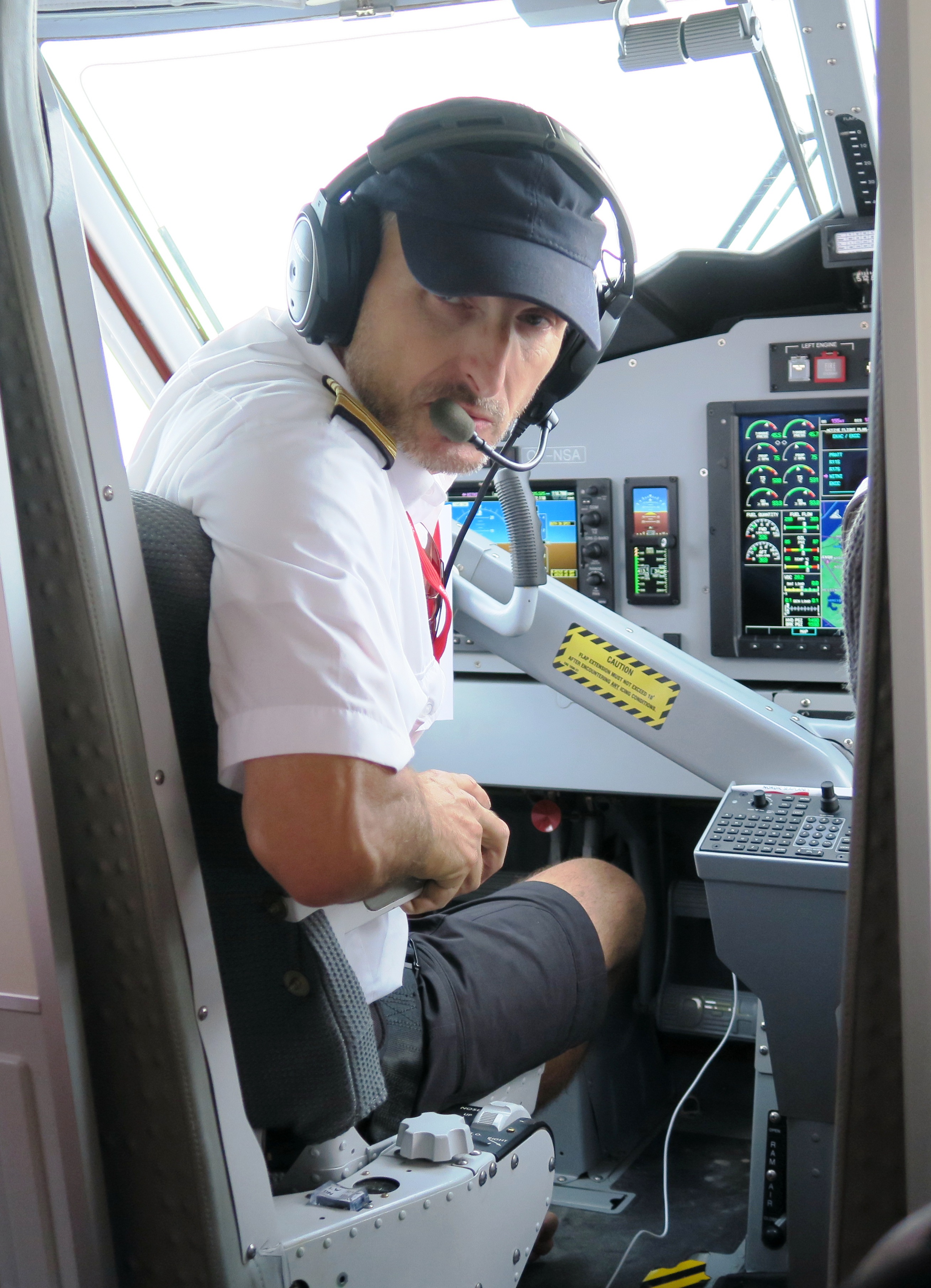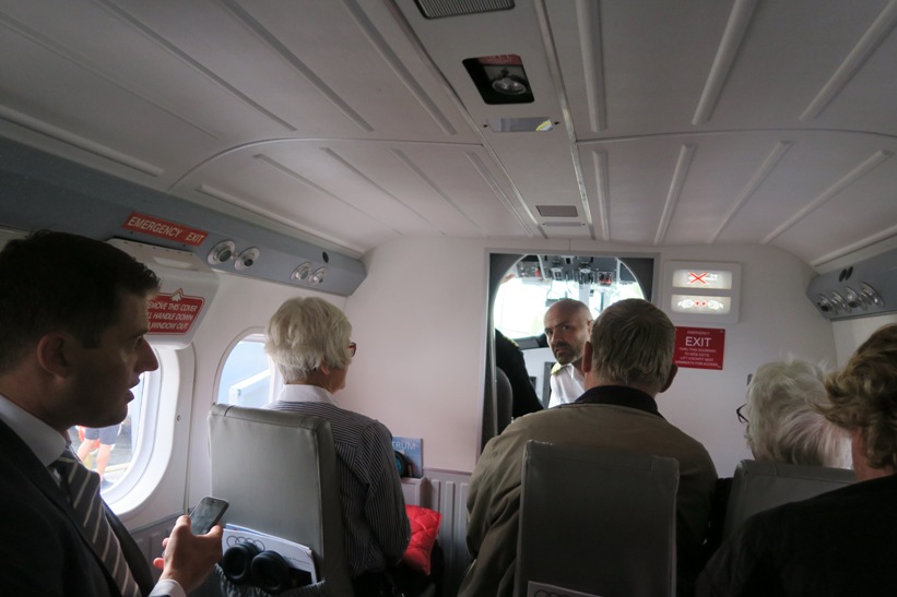 Jeg spottede med rimelig sikkerhed en enkelt forretningsrejsende med slips blandt passagererne. Resten var ubestemmelige bortset fra et par stykker, der som jeg bekendte sig som flynørder. Og den ene af piloterne var både humoristisk og afslappet, med shorts og sandaler. På hjemturen var der en polterabend-turist med, der havde fået turen som gave.