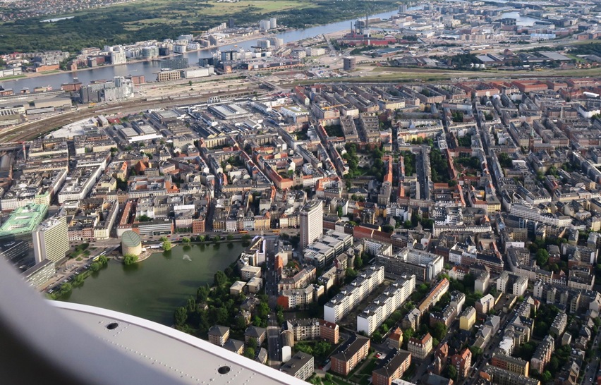 Det er altid imponerende at flyve over det centrale København i lav højde. Som her over Sankt Jørgens Sø med Planetariet (tv).