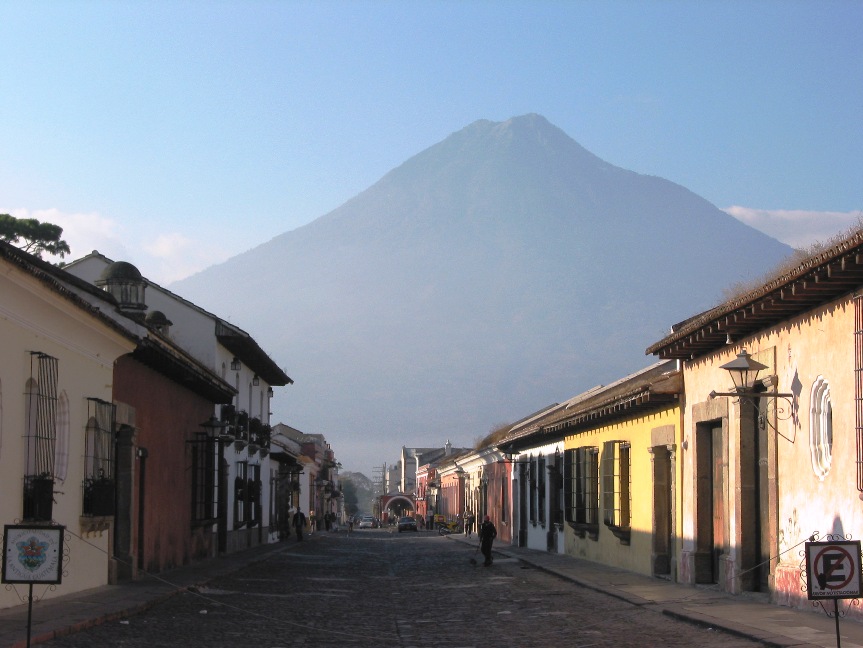 Morgenstemning i Antigua, med vulkanen Agua i baggrunden.