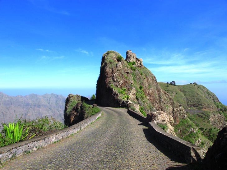 De fleste veje på Santo Antao er brostensbelagte som her, hvor vi har nået pashøjden og nu skal køre ned til kysten på øens nordside.
