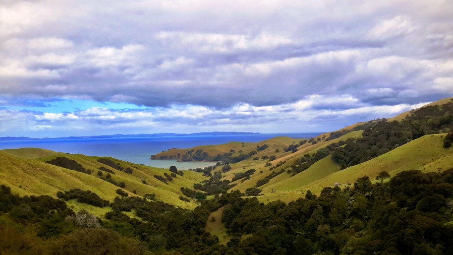 Bløde bakker og hav på Coromandel-halvøen, Nordøen, New Zealand.