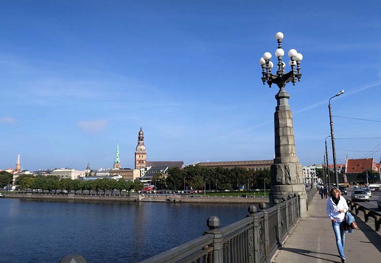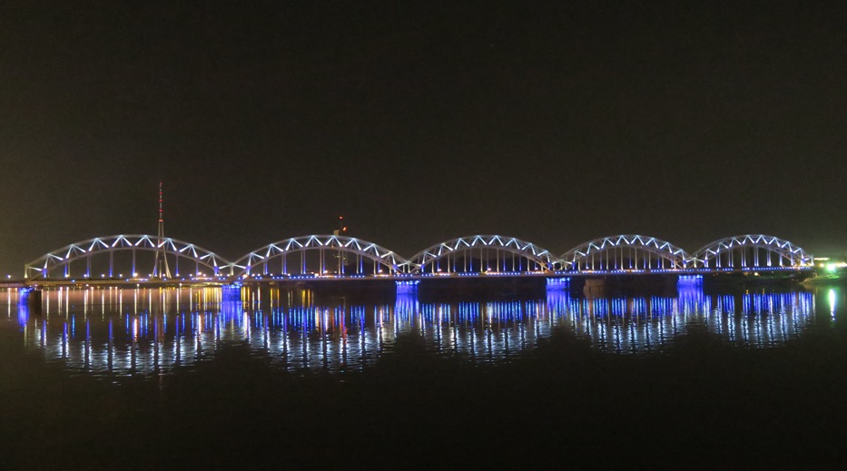 Der fører 3 store broer over Daugava-floden af hvilke den ene er en jernbanebro, som er smukt illumineret om aftenen.