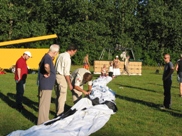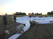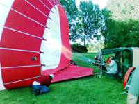 At klargøre en ballon er betydelig mere kompliceret end at slå et telt op eller klargøre en sejlbåd. Først skal kurven bugseres ud på græsset fra traileren, og dernæst skal selve ballonen pakkes ud. Selv om ballonstoffet måske kunne minde om et fjeldvandrertelt, så er det absolut ikke nogen let sag, til trods for dets flyveegenskaber! Udpakning og klargøring kræver faktisk hjælp fra en halv snes voksne mennesker. Når ballonen er pakket ud af posen, starter man med at blæse kold luft ind i den, mens den holdes på plads af en gruppe tovholdere. Og når det enorme monstrum har nået de rette dimensioner, overtages oppustningen af en gasbrænder, som sender store flammer ind i ballonen og fylder den med varm luft. Da tiden var inde, blev de 19 passagerer beordret op i kurven af skipper, mens tilskuerne hjalp med til at forhindre, at den steg til vejrs for tidligt. Gasbrænderen arbejdede på højtryk, og endelig oprandt det store øjeblik.