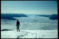 3. One of our great treks from the base camp went to the Sermilik Fjord. On this photo, we are standing several hundred meters above sea level, admiring the breathtaking view of the thousands of big and small icebergs of the fjord. In the far distance, you can see the beginning of the inland ice of Greenland, towering as a huge, white dome. Trekking westwards in this direction would lead you through 600 kilometers of a desert of ice until you would finally reach the rocks and mountains of the western Greenland.