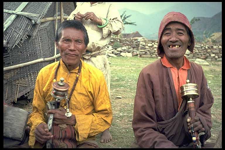 To tibetanske flygtninge med bedemøller i en flygtningelejr nær byen Pokhara.