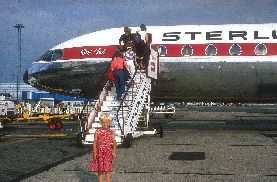 2. Den europæisk fremstillede supercaravelle var et af de fly, som indledte jet-alderen i slutningen af 1960-erne, især for charterturisterne, og det var stadig et meget benyttet fly til langt op i firserne. Jeg fløj med det første gang til Tenerife på de Kanariske Øer i januar 1967, og i forhold til de gamle propelfly var det langt hurtigere og også mere komfortabelt. At flyve med supercaravellen var som at være oppe i et svævefly, fordi de to motorer sad helt bagerst og derfor gjorde flyvningen næsten lydløs, med mindre man da sad på allerbagerste række. Billedet her er fra Kastrup i sommeren 1988, hvor jeg var på vej til ferie i Grækenland sammen med med min 4-årige datter.