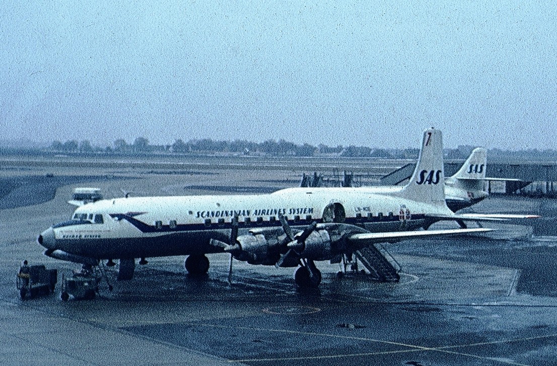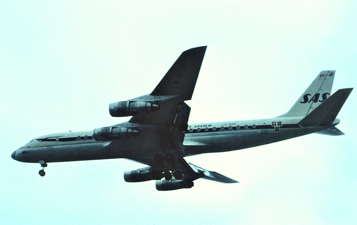 Min allerførste flyvetur var i sommeren 1962, hvor jeg fløj fra Kastrup til Milano med en Douglas DC-7 (til venstre). DC-7'eren var et af de sidste større propelfly for betalende passagerer, som var i drift før jetalderen satte ind. I første omgang med de store 4 motores DC-8 (til højre) og Boeing 707 langdistancefly.