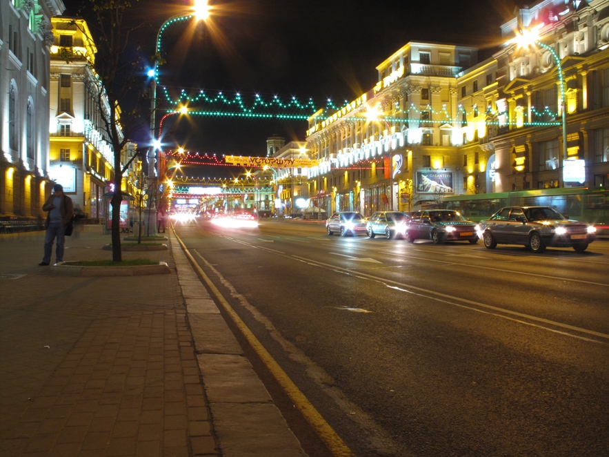 På aftenen før uafhængighedsdagen den 9. maj var gaderne i det centrale Minsk fyldt med festlig belysning.