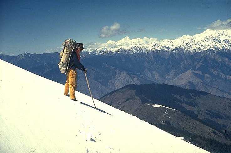 Selve trekking-turen fra civilisationen og op til Kanchenjunga tog ca. 2 uger. I starten af turen gik vi gennem et område med landsbyer, som var totalt upåvirkede af turisme. Vi gik på en højderyg i 2 - 3.000 meters højde og kom ind imellem op i de tætte rhododendronskove. Under skovgrænsen var der smålandsbyer beboet af Rai -og Limbu-folket. I modsætning til andre trekking-ruter i Nepal var der ikke antydning af hoteller, tiggeri eller souvenir-salg. Til gengæld gloede folk uhæmmet på os, især ved vores rastesteder. Men vores påklædning, udstyr og vaner har sikkert også været en kilde til undren hos dem - for slet ikke at tale om vores motiver til at holde ferie på denne måde helt frivilligt!