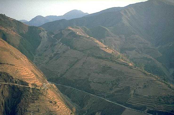 Fra den indiske grænse tog jeg med en lokal bus fra byen Raxaul op til Kathmandu i Nepal. Vejen, som er 130 km lang, blev åbnet i 1953. Efter et par timers kørsel gennem det flade Terai-bælte med skov nåede vi foden af Himalaya og begyndte at stige opad. Billedet er taget i eftermiddagssolen og viser noget af den fantastiske vej, som er omgivet af terrasse-marker.