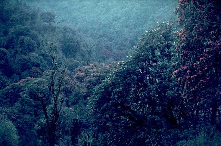 i aftenskumringen oppe i bjergskoven nær Gorapani-passet, omtrent midtvejs mellem Pokhara og