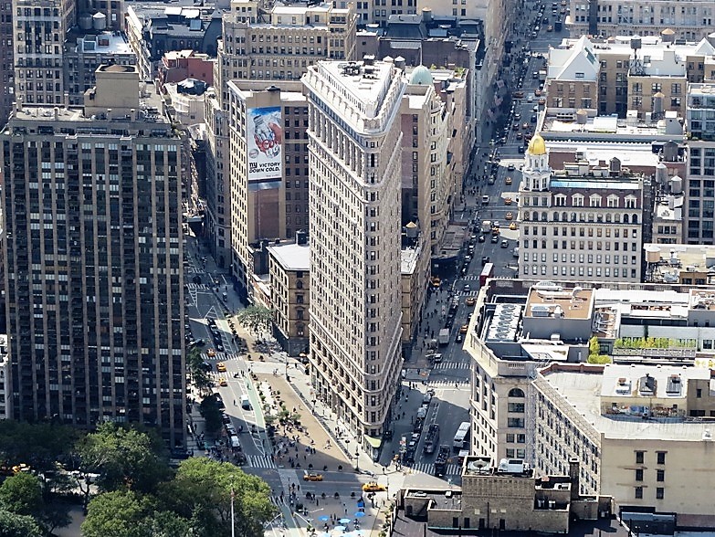 The Flatiron building close to Madison Square as seen on a magnified photo from Empire State Building. This remarkable building from 1902 was one of New York's first skyscrapers. Its name derives from the very special triangular shape.