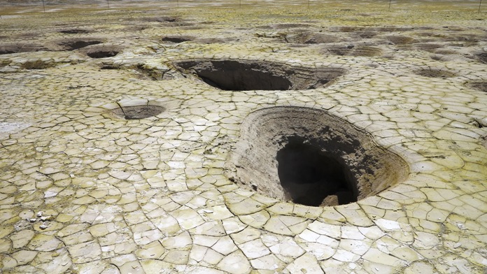 Fumaroler med svovldampe på bunden af Stephanos-krateret på øen Nisyros.