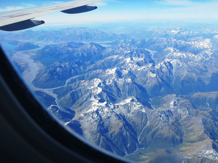 Our first view of New Zealand. Before the landing in Christchurch, we pass the Southern Alps.