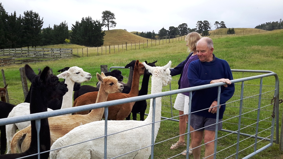 Vores værtspar i Coroglen Bed & Breakfast nær Whitianga havde opdræt af alpacaer, og manden (på billedet), som er født i New Zealand og har arbejdet som mekaniker og fisker, samlede på gamle biler og traktorer. Dem så vi også!