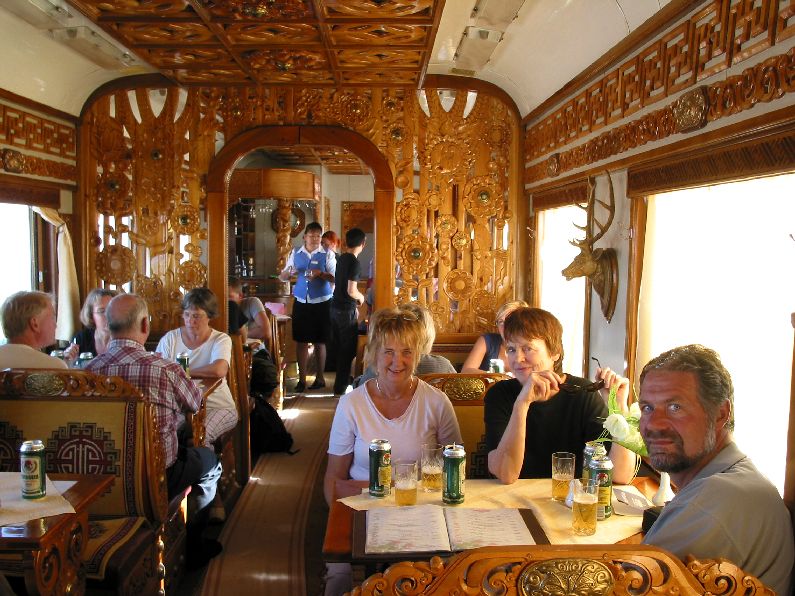 På vej gennem Gobi-ørkenen "The easy way". Spisevognen gennem Mongoliet var uden sammenligning den flotteste på hele togrejsen.